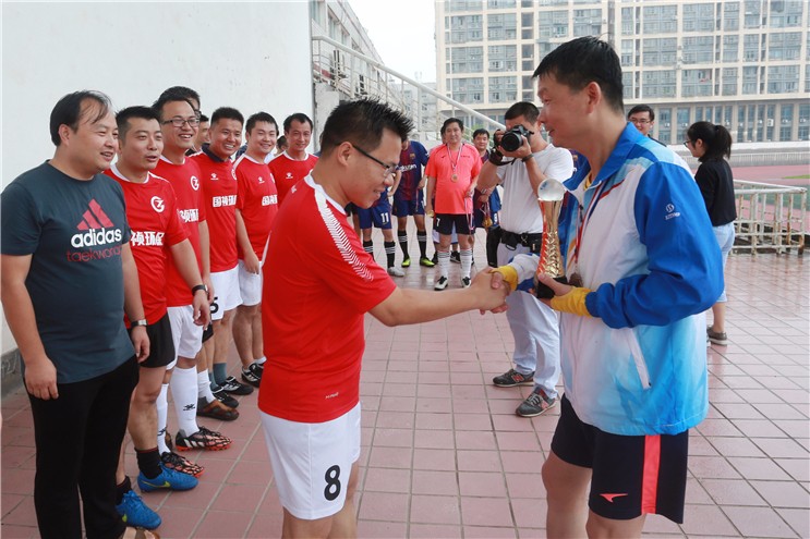 “首屆國禎環(huán)保足球邀請賽”由國禎環(huán)保主辦,合肥水務(wù)系統(tǒng)、上海市政設(shè)計六院、合肥市政設(shè)計院協(xié)辦,8月26日上午在安大龍河路校區(qū)開賽。經(jīng)過單循環(huán)賽后,9月3日上午舉行冠亞軍及三四名爭奪賽。最終,合肥市政設(shè)計院足球隊摘得桂冠,國禎環(huán)保足球隊勇奪亞軍。國禎環(huán)保副總經(jīng)理徐本勇、經(jīng)營總監(jiān)徐輝、財務(wù)副總監(jiān)王祥宇現(xiàn)場參賽、觀賽,并為獲獎球隊頒獎。